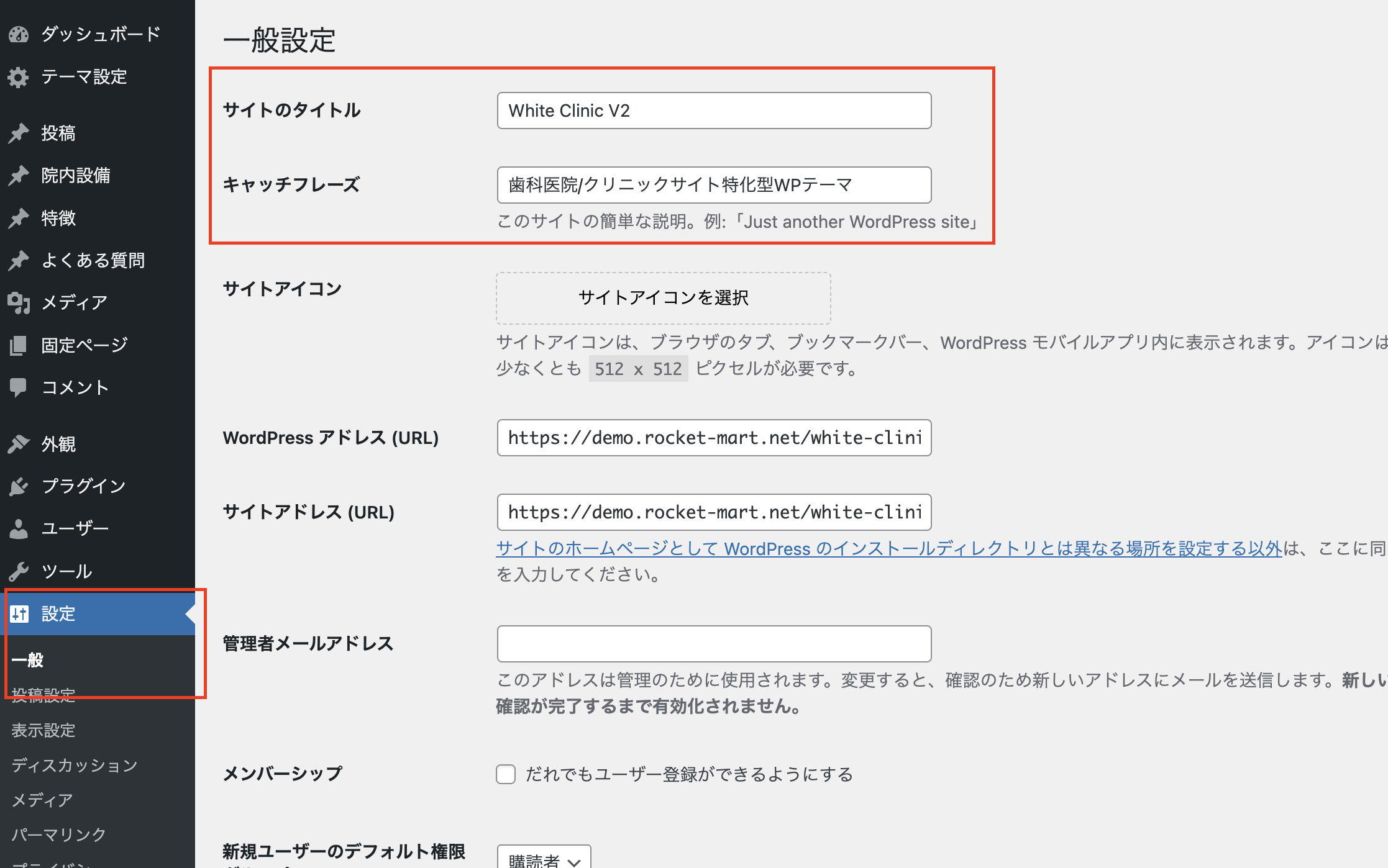 WordPress管理画面のメニューより、【設定 > 一般】と進みます。その画面で「サイトのタイトル」「キャッチフレーズ」をそれぞれ設定します。
