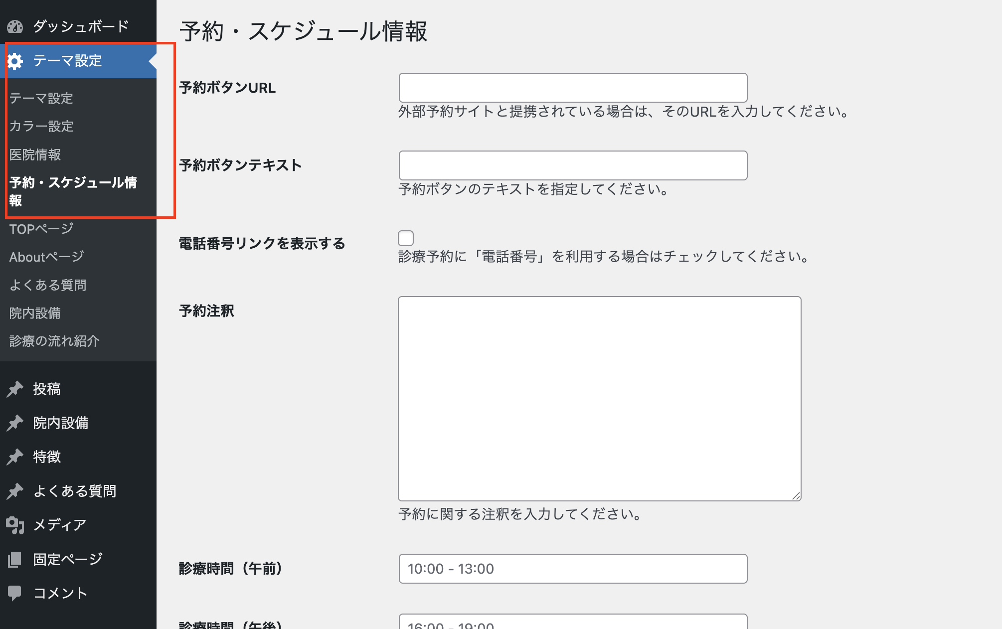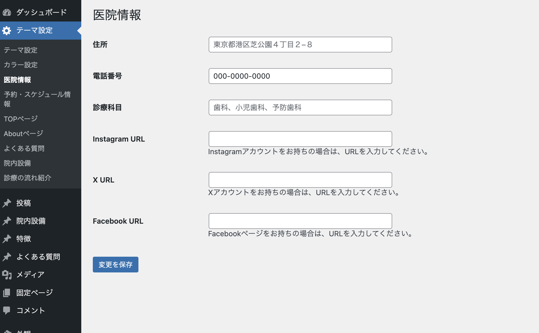 WordPress管理画面のメニューより、【テーマ設定 > 医院情報】と進みます。