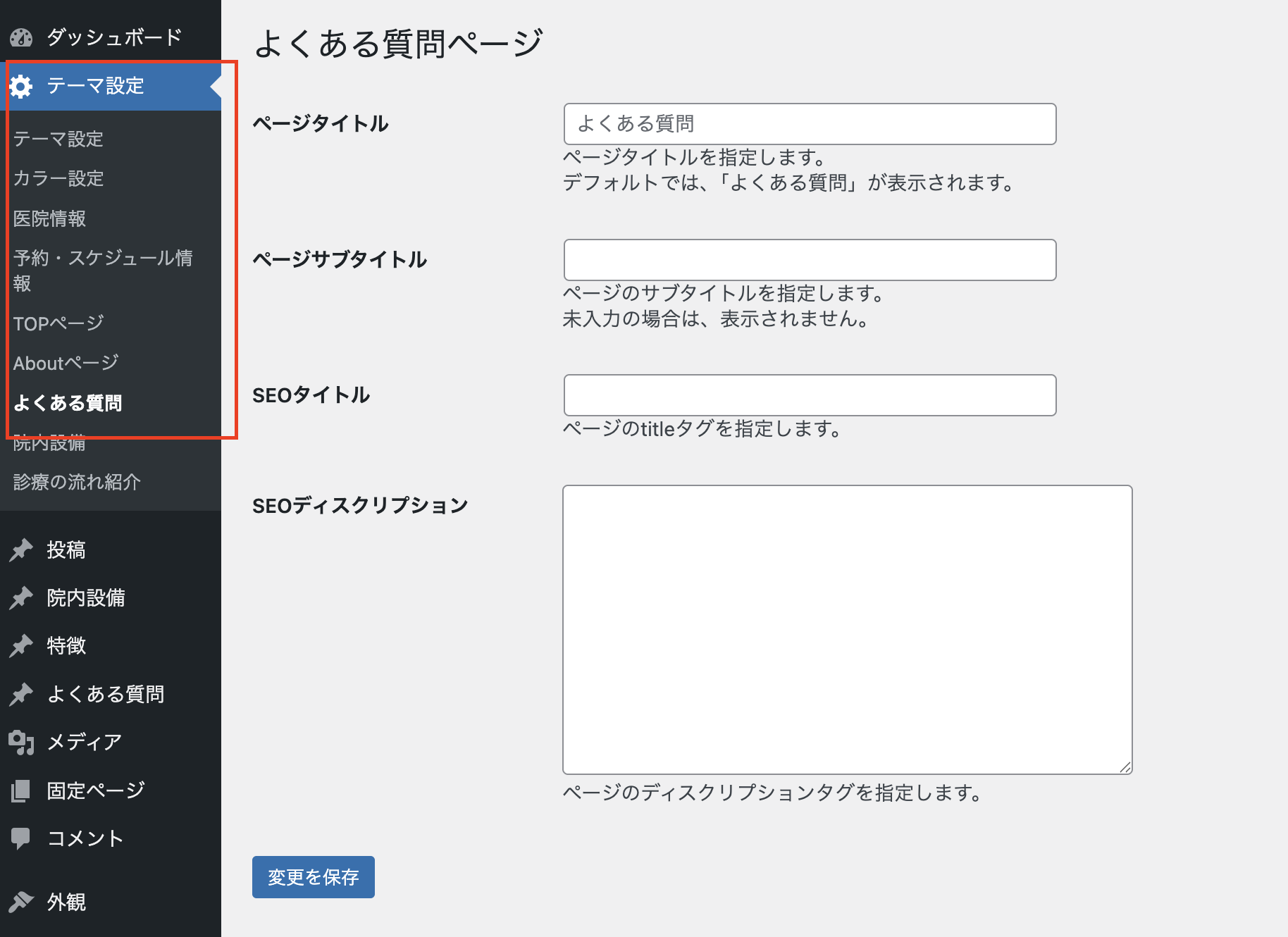 WordPress管理画面のメニューより、【テーマ設定 > よくある質問】と進みます。