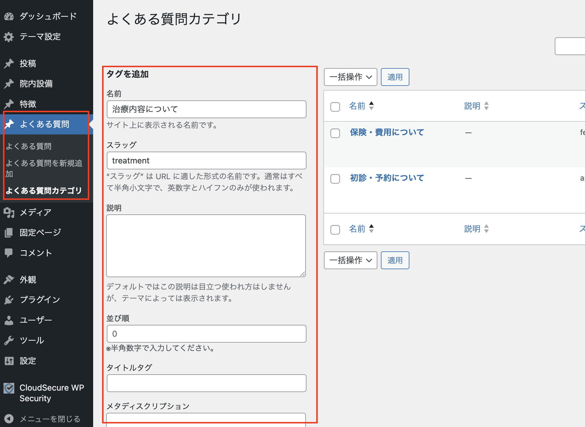 WordPress管理画面のメニューより、【よくある質問 > よくある質問カテゴリ】と進みます。