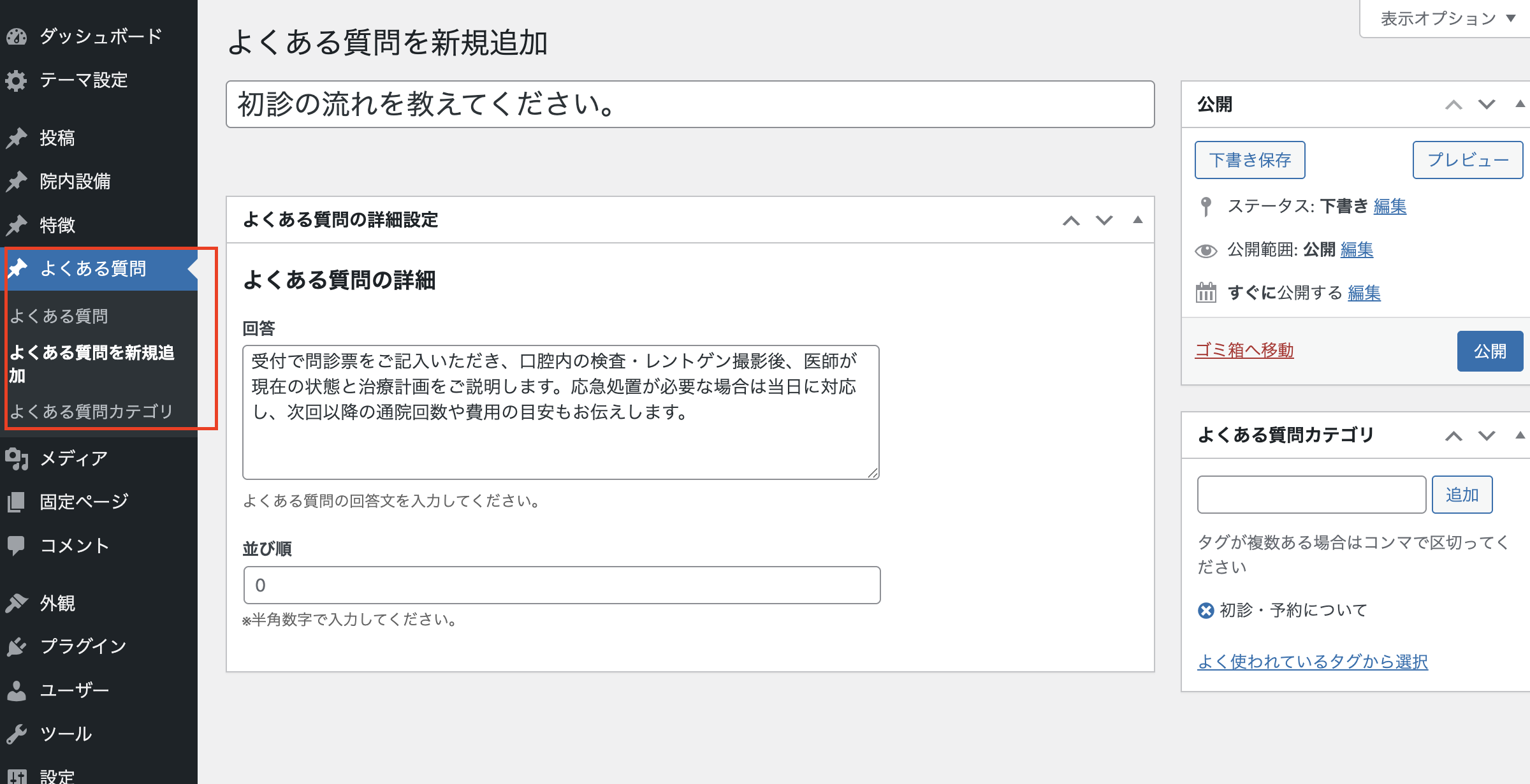 WordPress管理画面のメニューより、【よくある質問 > 新規追加】と進みます。