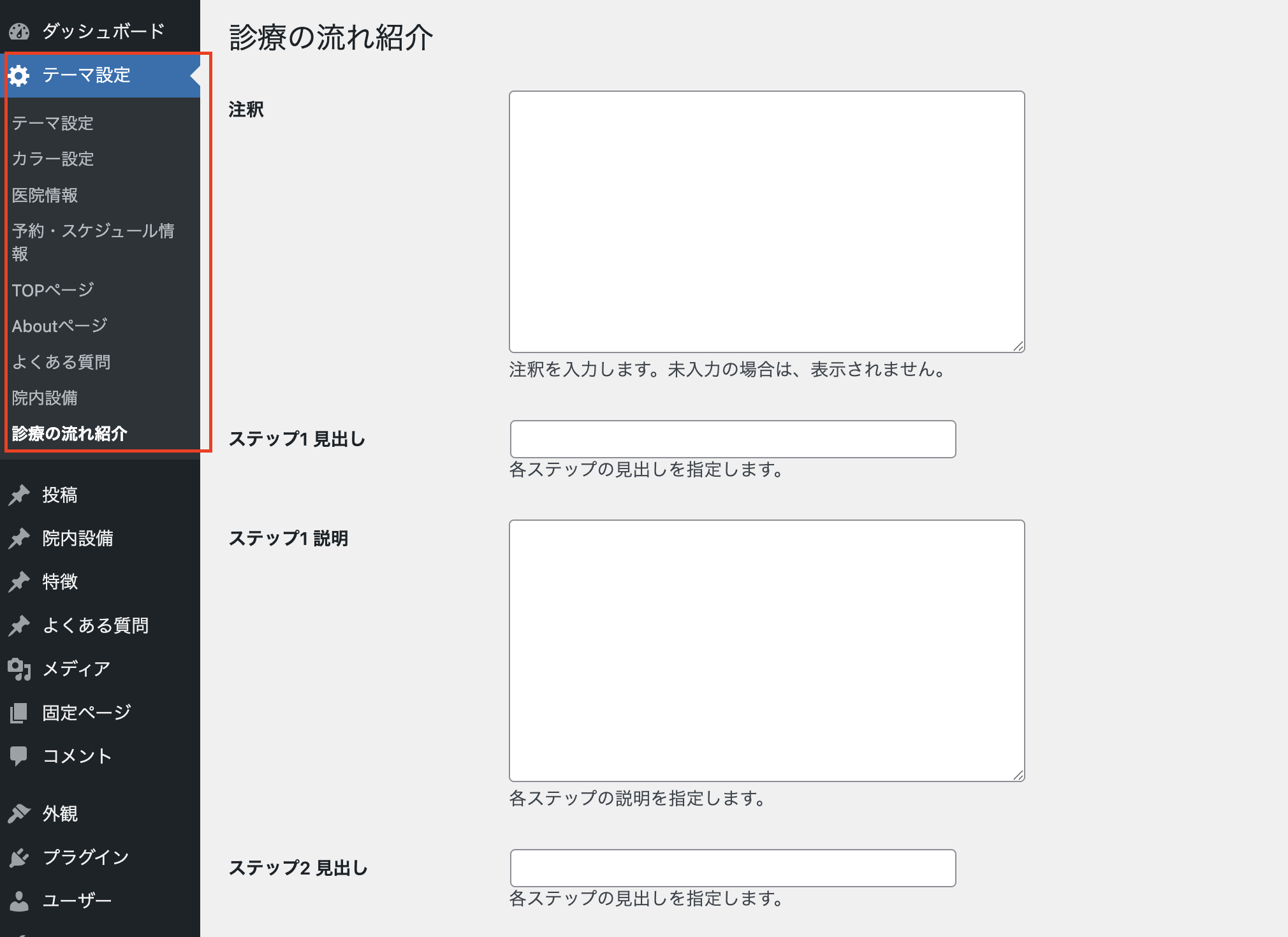 WordPress管理画面のメニューより、【テーマ設定 > 診療の流れ紹介】と進みます。