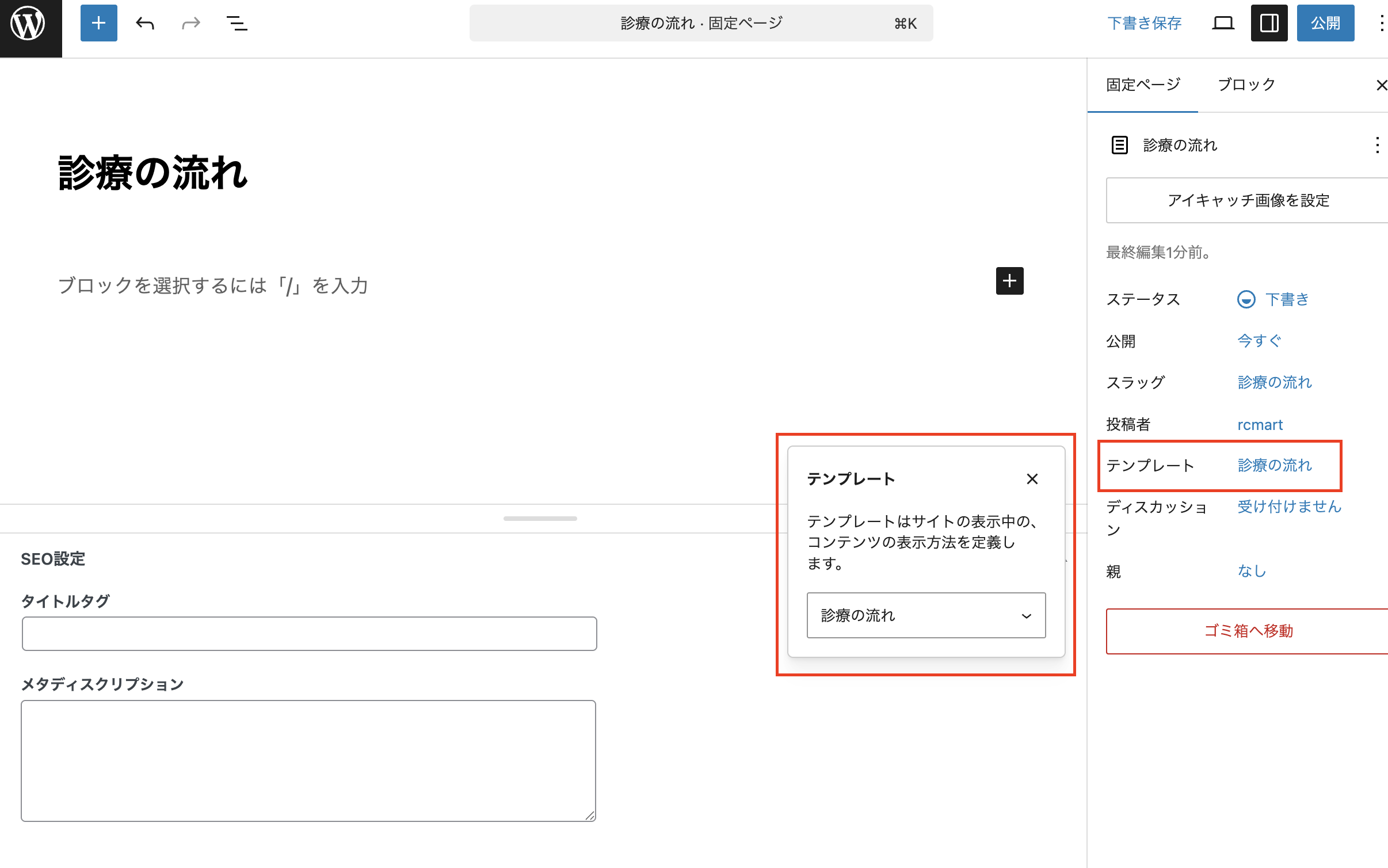 ページのSEO設定を行う場合は、以下の項目を「固定ページ」作成画面にて入力してください。