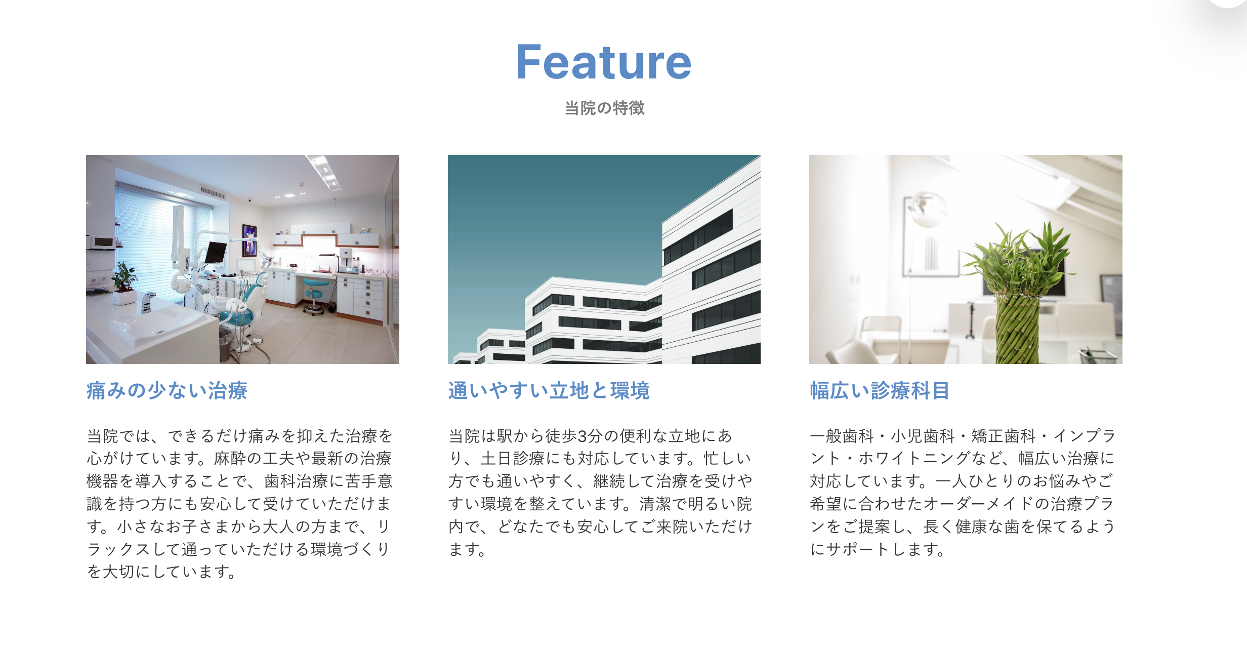 TOPページに以下のような、医院の「特徴」を表示することができます。