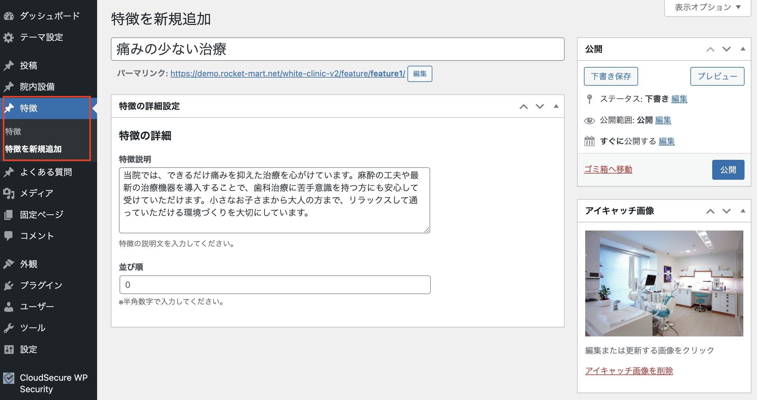 WordPress管理画面のメニューより、【特徴 > 新規追加】と進みます。